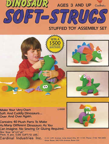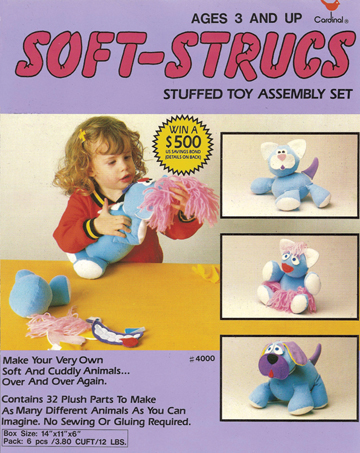Soft-Strucs was a construction toy whereby the child created various silly-looking animals. All the parts were soft fabrics with Velcro strips sewn to the surface. The child would stick the various body parts to other parts, thus creating silly-looking animals.