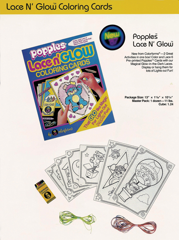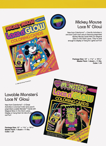 Lace N’ Glow was a new twist on the classic lacing card for young children. With the traditional toy, the child threads a lace through a drawing whose outline is composed of holes. I substituted a fabric lace with a phosphorescent filament so that the outline of the drawing glowed in the dark. Crayons were also included so that the art could be colored and enjoyed during the day.